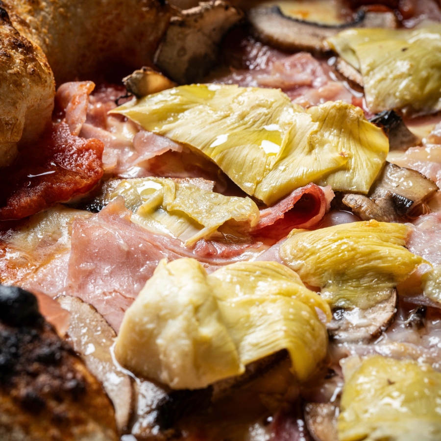 Salsa pomodoro, mozzarella, jamón cocido, hongos portobello, alcachofas