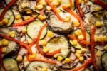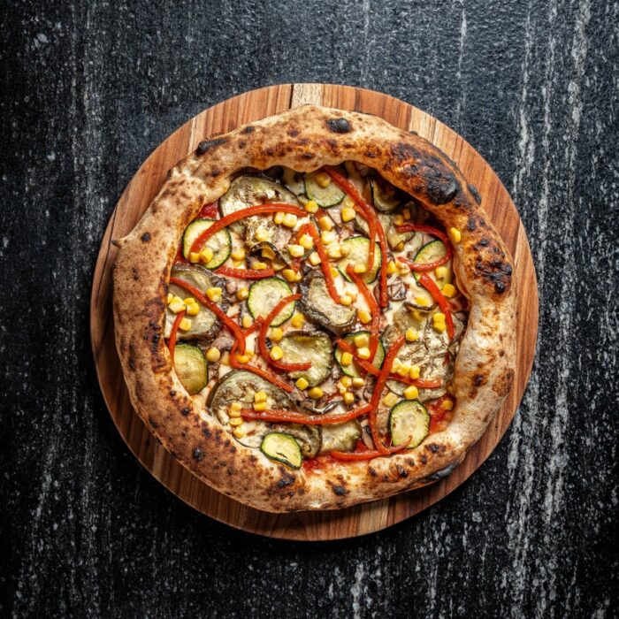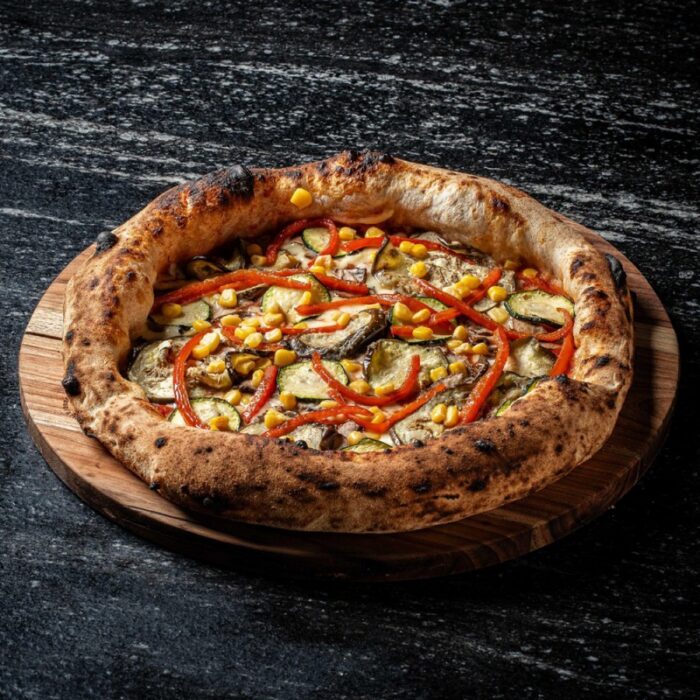 Salsa pomodoro, mozzarella, berenjena, zucchini, pimiento, hongos portobello, maíz